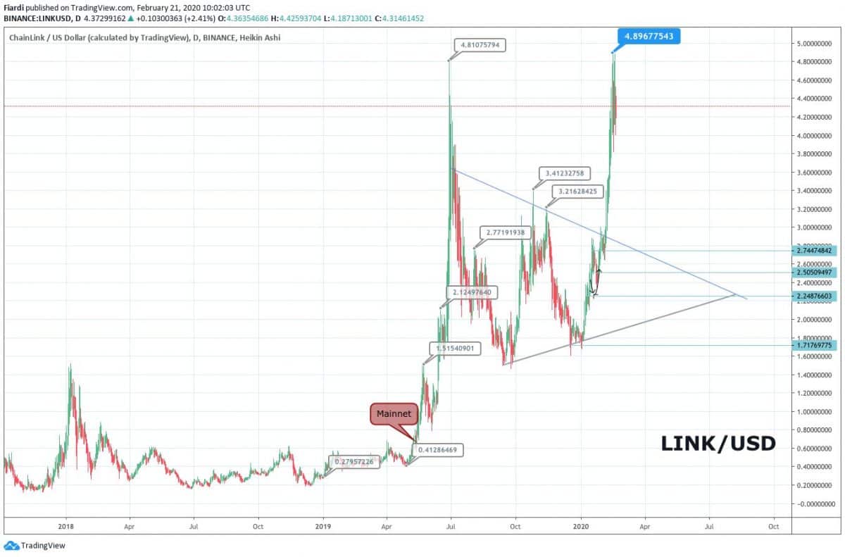 Link se dostává téměř do top 10 coinů dle kapitalizace. Stále více na sebe poutá pozornost svým růstem, kapitalizací i svou rebelskou povahou, kdy nerespektuje pohyby Bitcoinu. Link v roce 2019 končil se ziskem 545 %, přičemž už v létě roce 2018 zaznamenal odraz ode dna a je oficiálně v bull marketu. LINK se za 2 roky dostal již do top 20 nejlepších coinů dle kapitalizace a jeho momentální hodnota je 4,35 USD. Momentálně v roce 2020 již nastoupil na krátkou bullish jízdu, která mu přinesl za rok 2020 zisk 180,64 % a nové ATH. Včera dosáhl růstu 2,82 %.