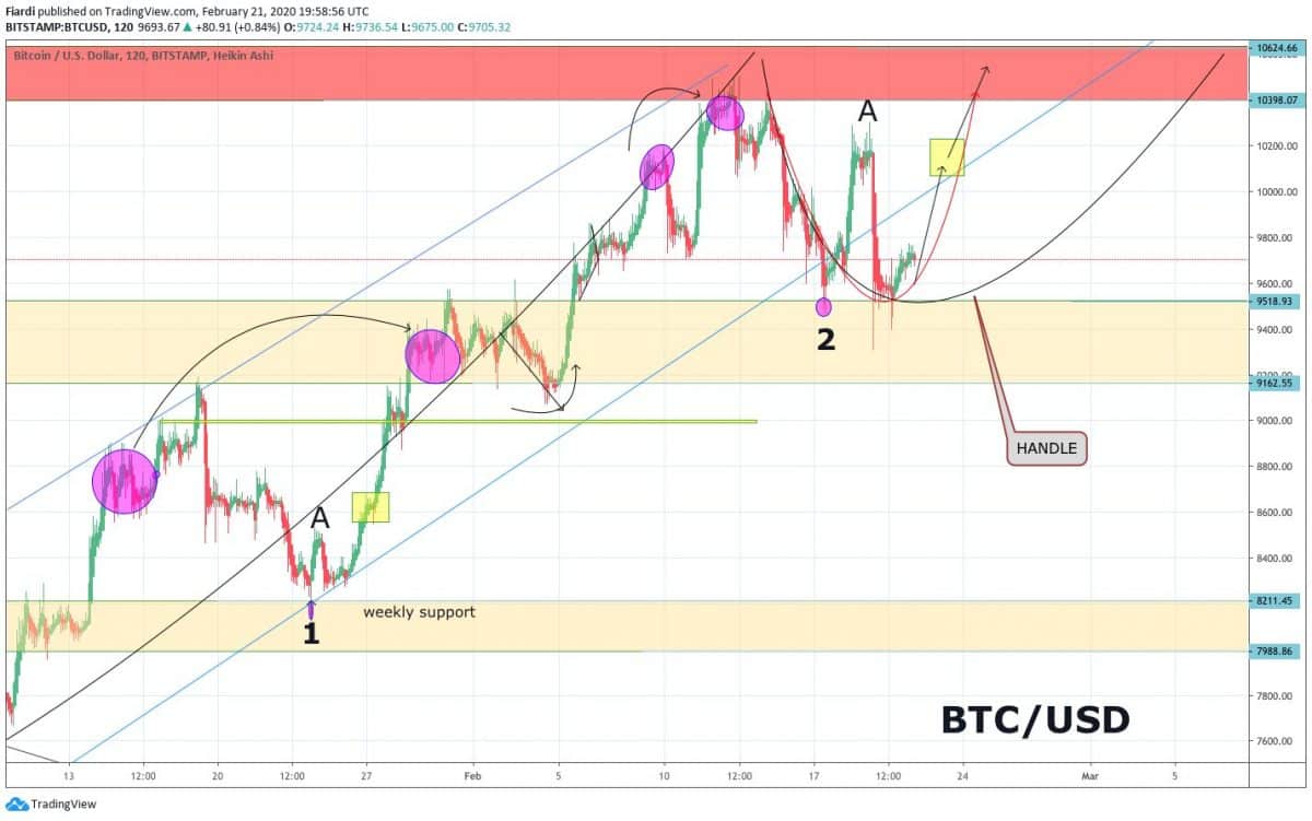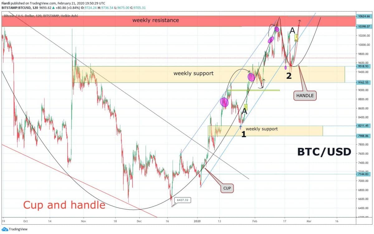 Bitcoin 20. února pozdě večer propadl znovu pod 10 000 USD a dostal se až k 9 500 USD. Včera jsme mírně rostli nahoru k 9 700 USD, kde se pohybujeme i v době psaní článku. Podle fraktální podobnosti se nacházíme v cyklu 2 na pásmu A.