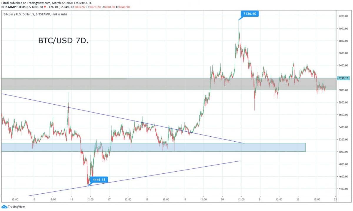 Bitcoin se nám o víkendu ustálil nad 6 000 USD a teď se čeká na světové trhy, jak v pondělí otevřou a co se následně bude dít. Vidíme to stále, počet nakažených stoupá, počet ekonomických omezení také stoupá a v US to brzy začne také. Nemyslím si, že na světových trzích jsme již viděli letošní dno, právě naopak. Bitcoin by se měl pohybovat podobně jako světové trhy, už měsíc přesně ten pohyb kopíruje. To, že v minulém týdnu se ten pád podařilo zastavit finanční injekcí, z dlouhodobého hlediska (jestliže bude krize pokračovat) neznamená vůbec nic. Dříve či později zase propadneme a dost možná již v příštím týdnu.