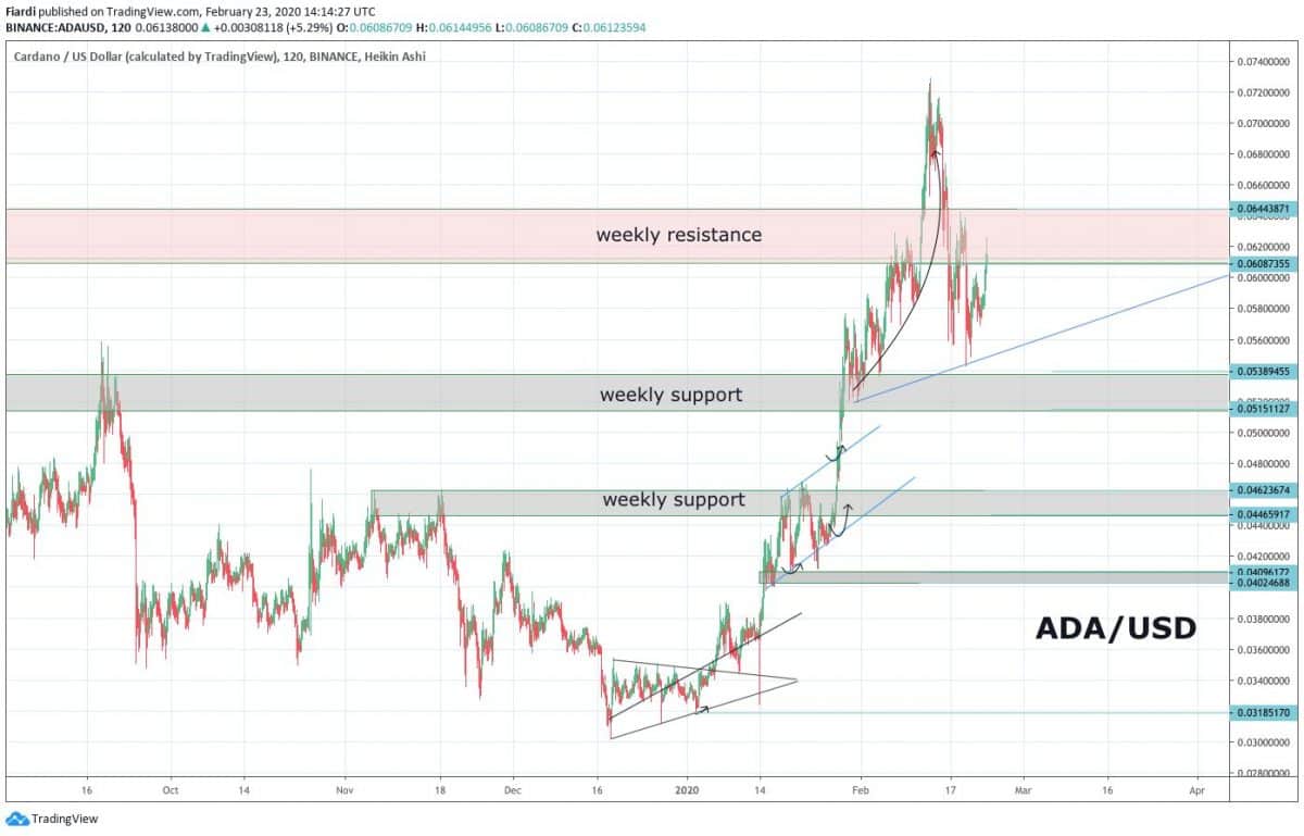 Dnešní 4hodinová relace se dnes zahájila vytvořením bull svíčky na 0,061 USD v oblasti rezistence. Více o ADA / USD jsme psali v samostatné analýze v neděli. ADA úspěšně dokončil hardfork.