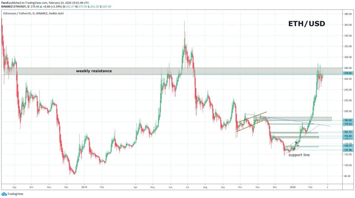 Bitcoin se včera krátce dostal na 10 000 USD a momentálně jsme na hodnotě 9 900 USD a naši predikci neměníme. Myslíme si, že Bitcoin kopíruje fraktální podobnost z předešlého cyklu a predikovali jsme růst od 9 500 k 10 500 USD. Momentálně jsme na 9 900 USD a pohyb nám zatím vychází. Zároveň BTC tvoří od nového roku obrovský vzor cup and handle. Nejbližší podpora bude stále na 9 500 USD, odpor čekáme na 10 300 – 10 700 USD. Včera jsme přidali 2,45 % do plusu.