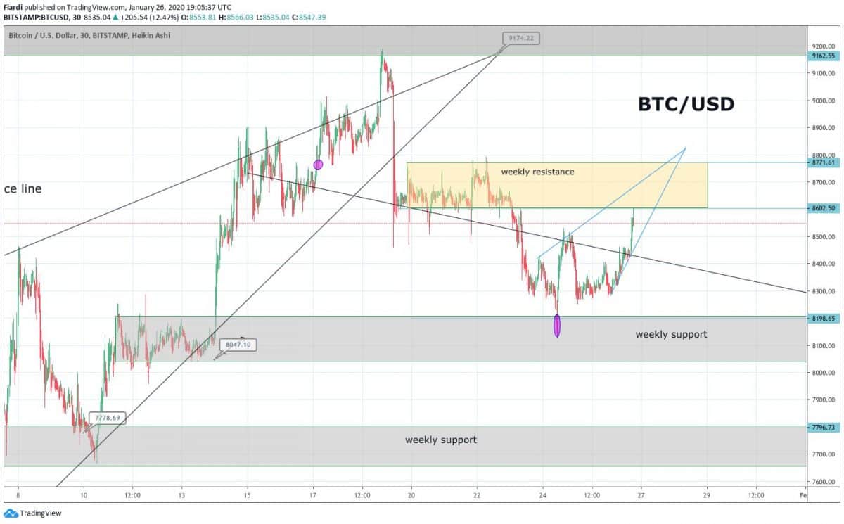 Předevčírem v našem přehledu trhu jsme tu psali o skončení propadu na 8 200 USD. Momentálně jsme na 8 550 USD a včera Bitcoin předvedl 3% růst, který může pokračovat i dnes, tak se nezapomeňte podívat na přehled trhu, jsme tu pro Vás téměř každý den. Bitcoin je zase bullish (2D) a na trhu znovu vzbuzuje pozornost. Odraz na 8 200 USD podpoře byl velmi silný a za 2 dny jsme přidali už 350 USD na hodnotě. Nejbližší odpor vidíte na grafu ve velikém pásmu, který se táhne od 8 600 – 8 770 USD. Vytváří přitom i pattern, který připomíná rising triangl, doufejme že na konci nebude obrovský propad.