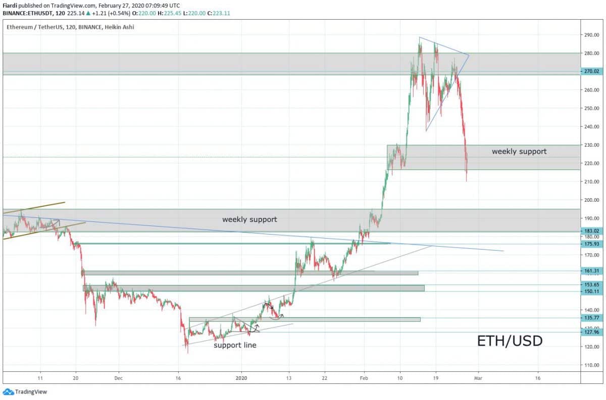 Ethereum propadlo o 27 % od svého high na 289 USD. Momentálně jsme na hodnotách 222 USD a stejně jako celý trh, tak i Ethereum propadlo výrazně dolů. Včera jsme se dostali na podporu v oblasti 216-230 USD. Dnes se bude lámat chléb a uvidíme, jestli tuto podporu udržíme, či nikoliv.