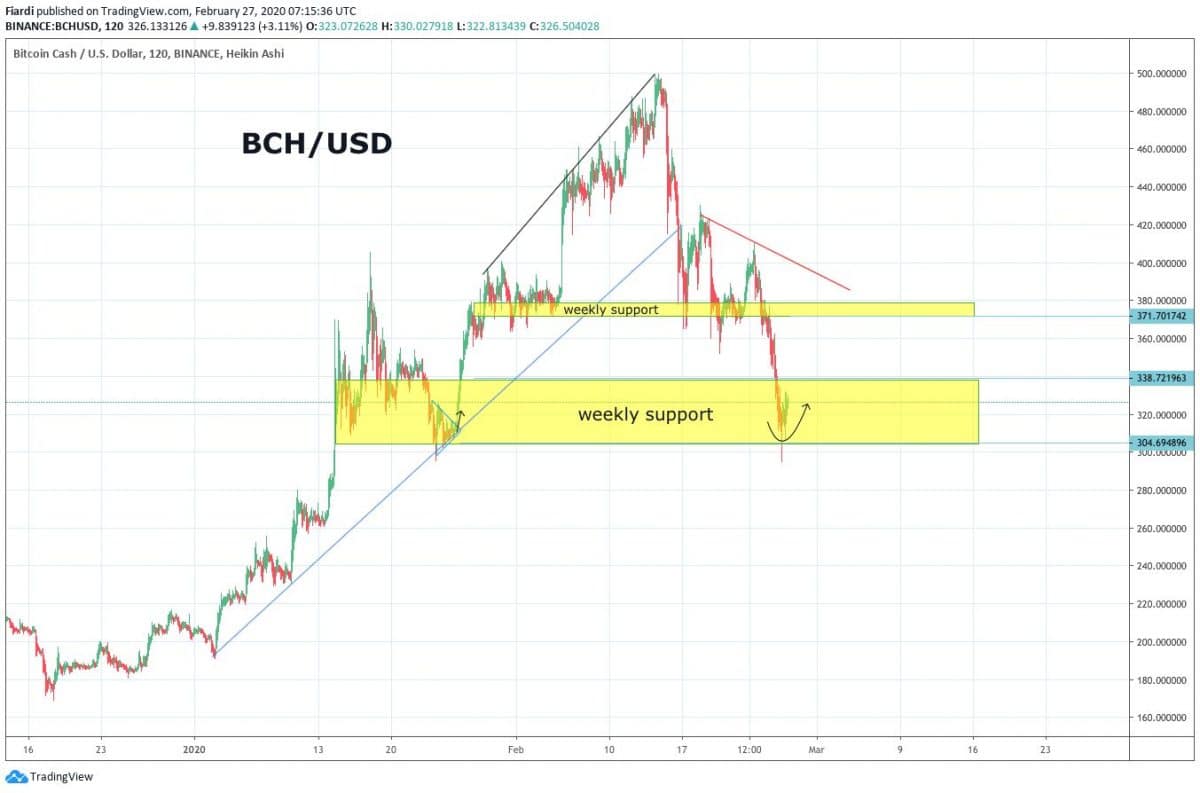 Stejně špatné (možná i horší) to je na BCH / USD grafu. Ten propadl od high v roce 2020 o 41 %. Včera se dostal do pásma podpory, kde se zastavil. Pásmo vidíme v oblasti 304 – 338 USD. Dnes brzy ráno vidíme mírný odraz, všechno to nakonec ale bude mít ve své moci jen Bitcoin.