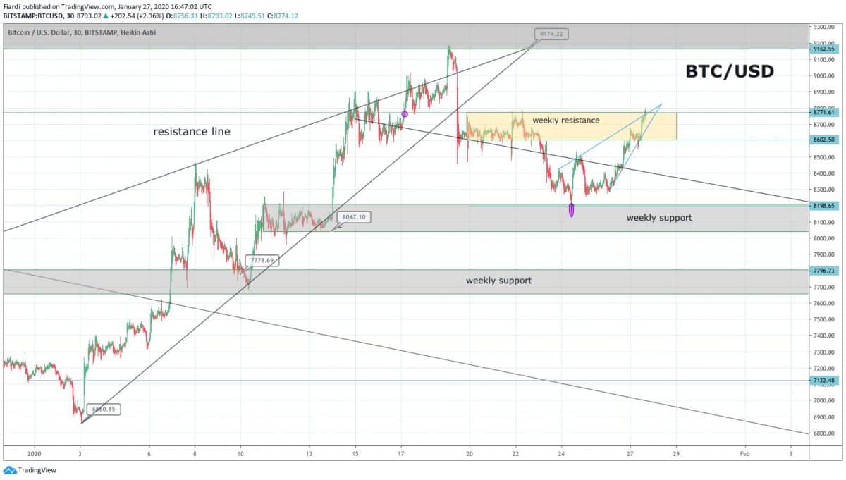 Náš předešlý přehled si můžete přečíst zde: [Přehled trhu] 27.01. [BTC] Bitcoin bullish k 8 770 USD? [ICON] 13%[DASH] 11%[BCH] 14%[BTG] 11% Forky Bitcoinu hlásí nový bullish!