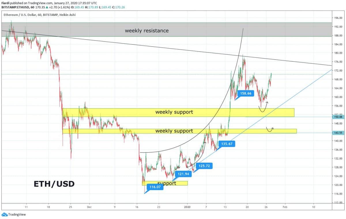 Stejně jako Bitcoin tak i Ethereum dnes rostl. Momentálně jsme se dostali na hodnoty 170 USD. Na grafu vidíme odraz od supportu na 155 USD. Nejbližší odpor vidíme na hodnotách 178 USD. Zdá se, že Ethereum se bude snažit dostat na letošní top jako momentálně Bitcoin. Další odpor nás bude čekat na 188 USD. Včera jsme přidali na růstu 3,5%.