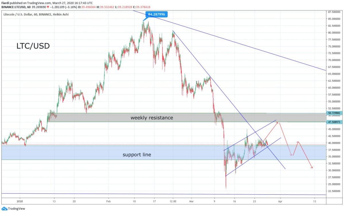 Momentálně vidíme cenu 39 USD za jeden LTC. Odpor vidíme na 50-52 USD. Momentálně tvoří Litecoin vzestupný kanál, který by měl skončit na 50 USD. Podporu vidíme na 33 USD. Stejně jako Bitcoin, tak i Litecoin se odrazil ode dna a prakticky celý týden rosteme vždy o pár procent. Problémem tohoto růstu je, že je to umělé – jak na NASDAQ, tak i na Bitcoinu.