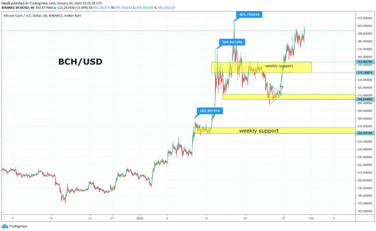 Ani BCH si nevede špatně, když v roce 2020 využil FOMO na Bitcoin SV a propagaci C. Wrigta. Celkový růst představuje +90%. Nejbližší odpor vidíme na letošním maximu při 405 USD. Nejbližší podporu jsme testovali na 353 USD.