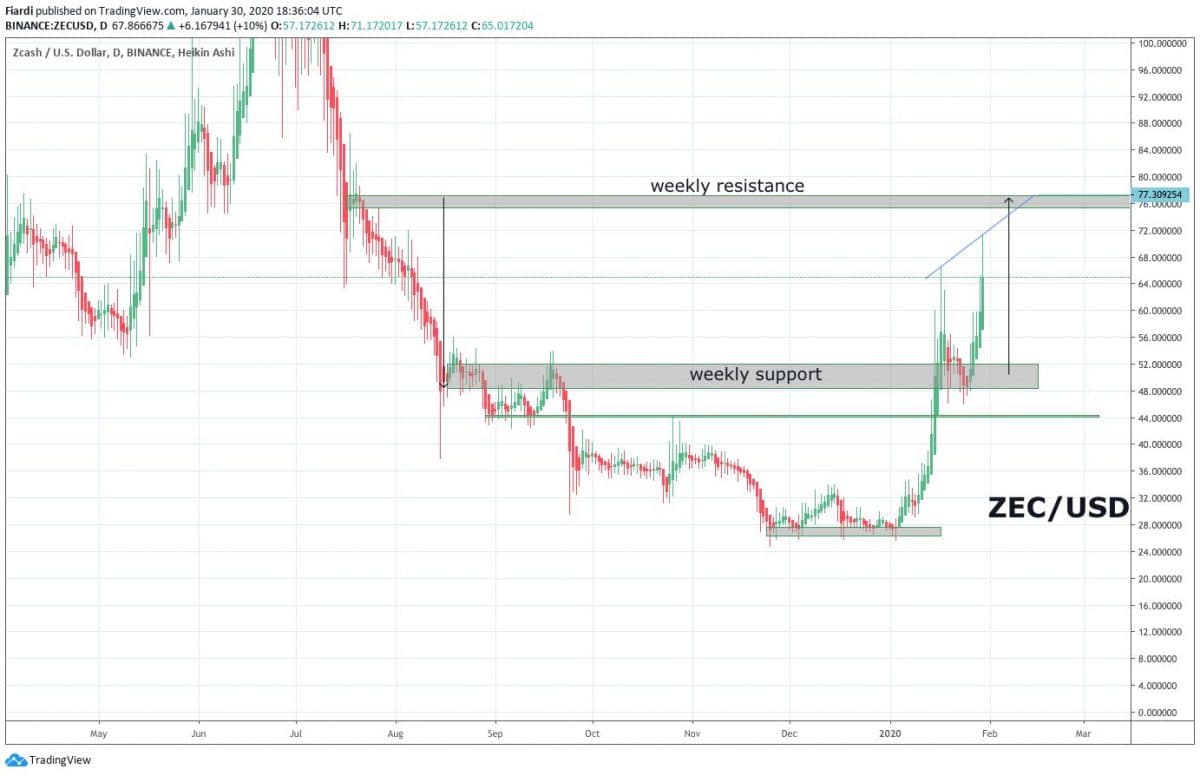 Až 20% z toho, co vytěží těžaři, jde zpět do ZEC na vývoj. Na rozdíl od BCH komunity tyto % byla odhlasována těžaři i komunitou. BCH se bálo bojkotu a tak žádná daň nebude. Včera přidal ZEC na růstu dalších 8%, vidíme přitom již +138% růst v roce 2020. Nejbližší odpor na ZEC zaznamenáváme na 77 USD.