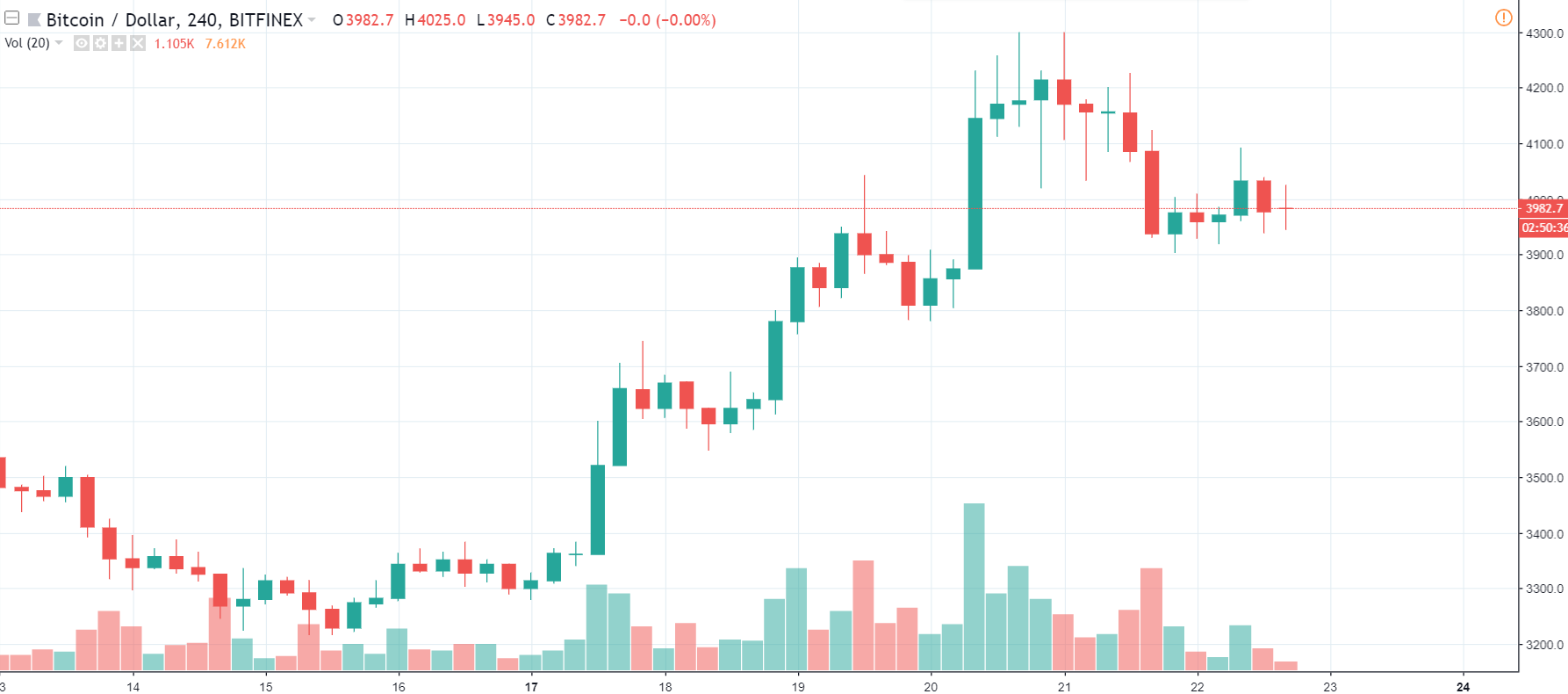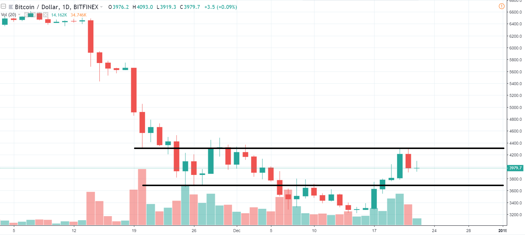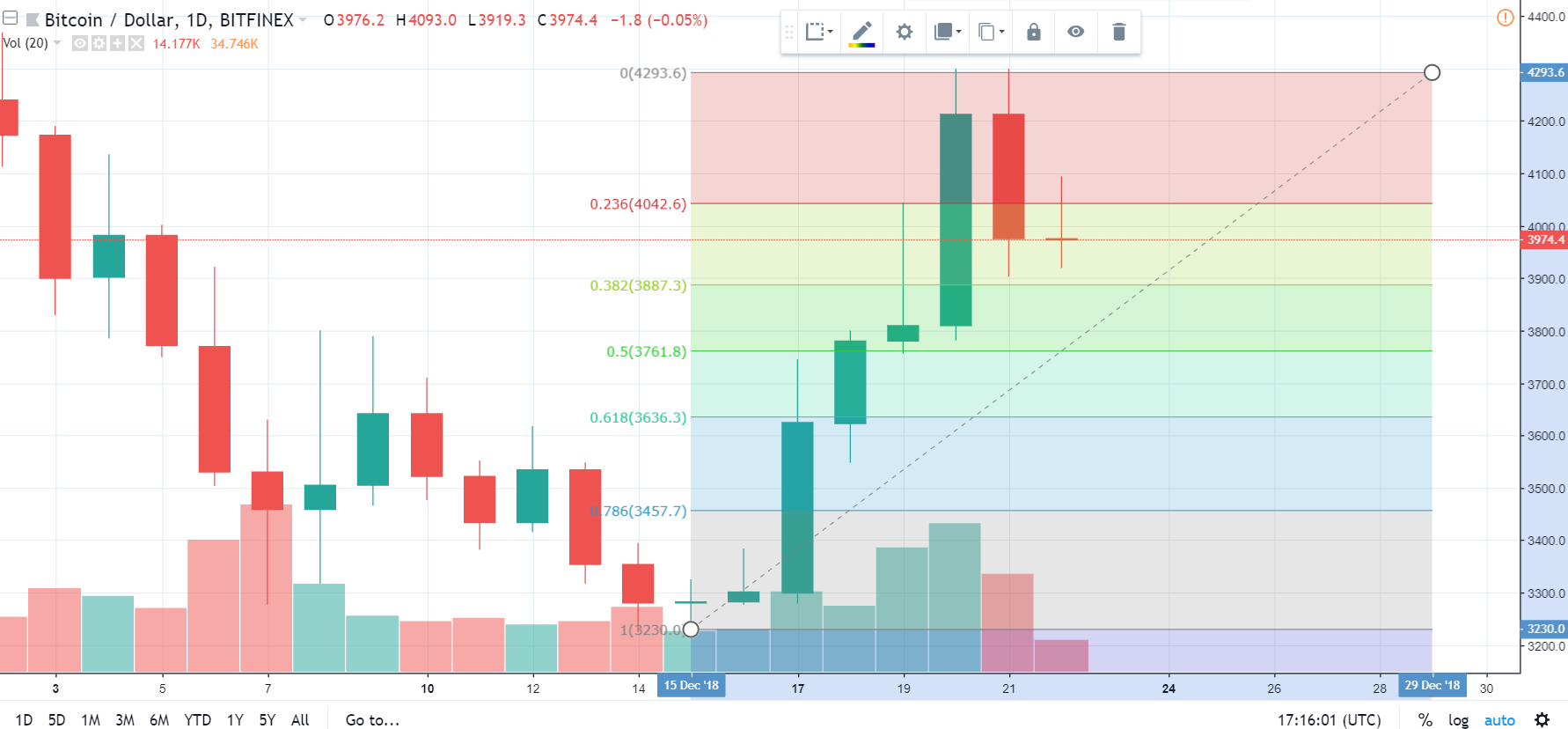 Trh s kryptoměnami včera korigoval růst, který jsme zažili v průběhu týdne. Včerejší retracement skončil na 38,2% fibo úrovni (viz graf) a dnes se nám na grafu vytvořila Doji svíčka, která symbolizuje nerozhodnost na trhu (ovšem ještě není konec dne a svíčka se neuzavřela). Kurz Bitcoinu po korekci mírně roste a akumuluje na hladině 4000 $. RSI na daily grafu ukazuje 50 bodů, na větších timeframech jsme výrazně přeprodaní. Všechny signály ukazují na to, že přes Vánoce budeme růst.