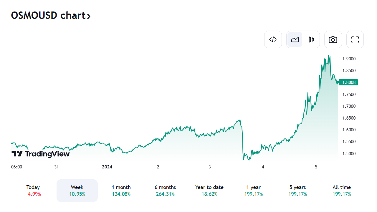 Domácí token Osmosis (OSMO) zažil významný nárůst, obchoduje se kolem 1,7 dolaru, což je o 130% více za posledních 30 dní. Tento nárůst je svědectvím zvýšené aktivity a zájmu o platformu.
