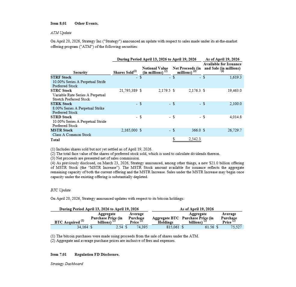 Každé pondělí čeká kryptosvět, co tentokrát napsal Michael Saylor na síť X. Tentokráte přišel vzkaz, který překonal očekávání i ten nejoptimističtější odhad posledních týdnů. Mezi 13. a 19. dubnem 2026 Strategy přikoupila 34 164 BTC při průměrné ceně 74 395 dolarů.