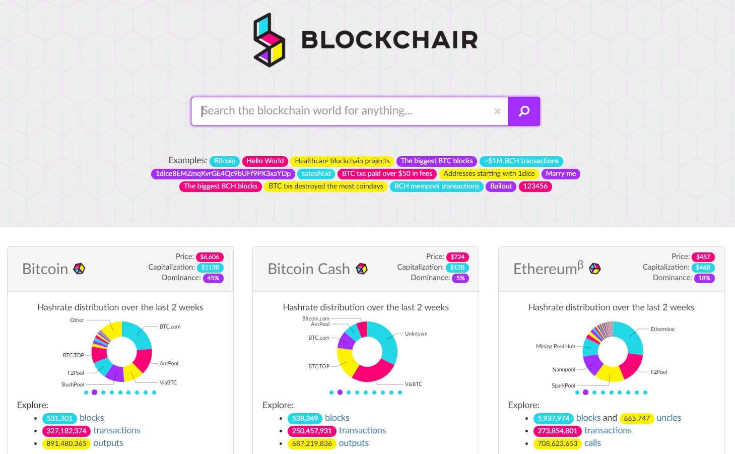 Blockchair je blockchainový vyhledávací a analytický nástroj podporující kryptoměny Bitcoin, Bitcoin Cash a Ethereum. Svým návštěvníkům umožňuje filtrovat a třídit bloky či transakce na základě různých kritérií. Rovněž poskytuje i možnost fulltextového vyhledávání. Aktuálně je z hlediska možností zadávání různých vyhledávacích parametrů tato stránka bezkonkurenční.