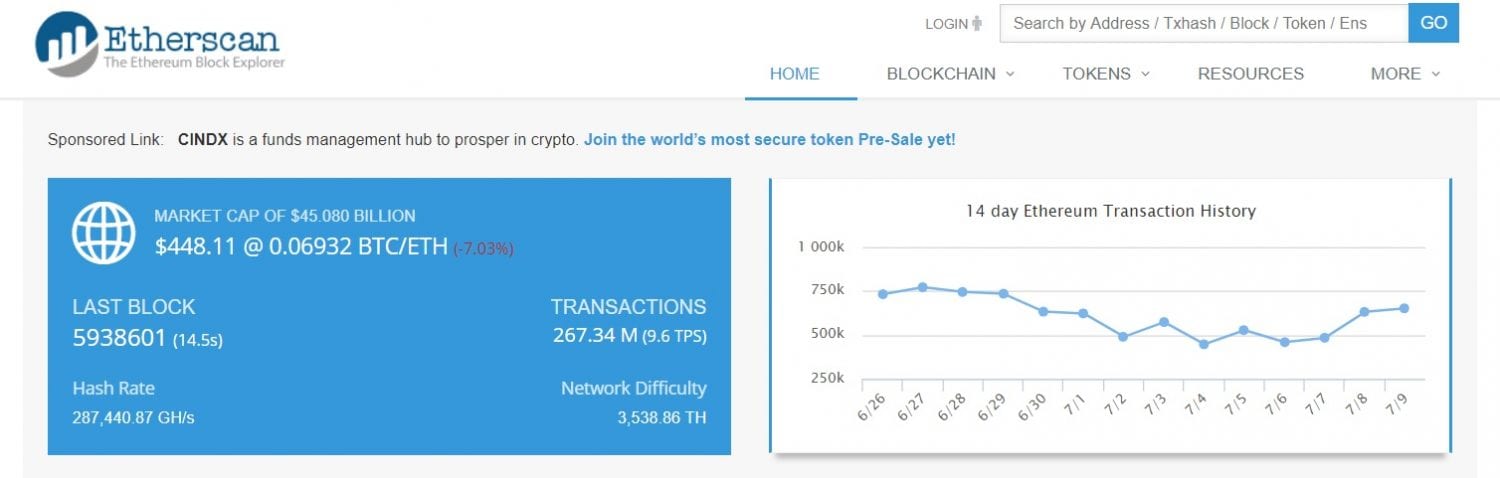 Přestože existuje řada slušných ethereových explorerů, Etherscan.io se dá považovat za nejoblíbenější. Poskytuje možnost vyhledávání adres smart kontraktů, sledování gas price či ověřování zůstatků tokenů na adresách majitelů. Také nabízí ucelený přehled všech ERC20 tokenů, přičemž v přehledné tabulce k nim kromě základních informací přiřazuje i jejich cenu, procentní změnu jejich hodnoty nebo zobchodovaný objem za posledních 24 hodin. Přidanou hodnotou je určitě i „mining“ kalkulačka a DEX tracker.