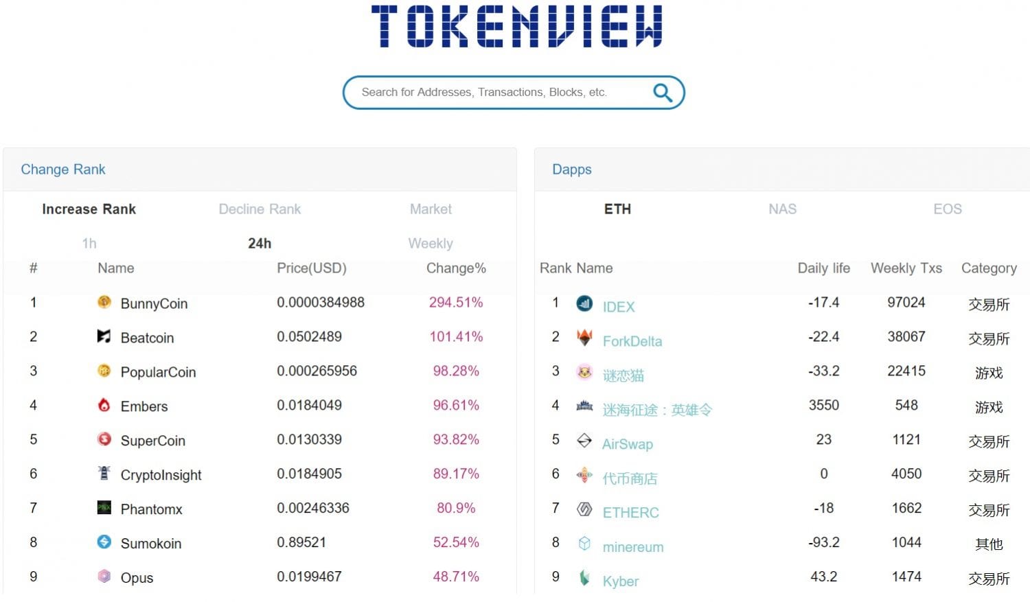 Tokenview.com, který byl vyvinut čínským týmem teprve začátkem tohoto roku, nabízí možnost vyhledávání adres a transakcí pro široké množství coinů. Mimo těch nejběžnějších jako Bitcoin, Ethereum a Litecoin nabízí i přehled kryptoměn jako DASH, OmiseGO, Zcash či Dogecoin. Zajímavostí je i implementace grafu z Bitfinexu, který je ale bohužel v čínštině. Kromě výše zmíněných možností disponuje Tokenview i sekcí nazvanou CoinBasic, v níž stručným popisem vysvětluje princip a fungování dané měny. Součástí přehledu každé kryptoměny je také seznam nejbohatších adres.
