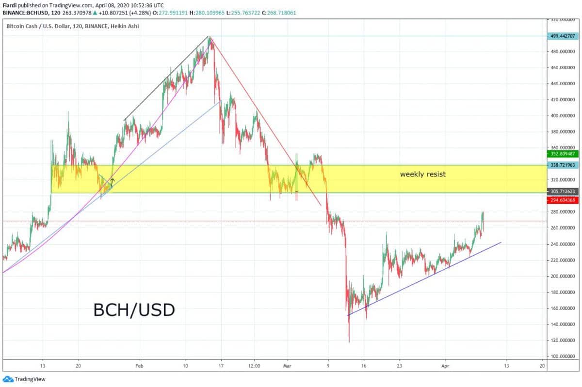 Momentálně vidíme hodnoty za BCH na 269 USD. Jeho odpor začíná na hodnotách 305 USD. Mnozí budou BCH sledovat, aby predikovali cenu Bitcoinu a to, jak bude reagovat po Halvingu za měsíc. BCH může hodně napovědět o budoucí hodnotě BTC, nejen po Halvingu, ale také protože je to samozřejmě hardforknutý coin od Bitcoinu.