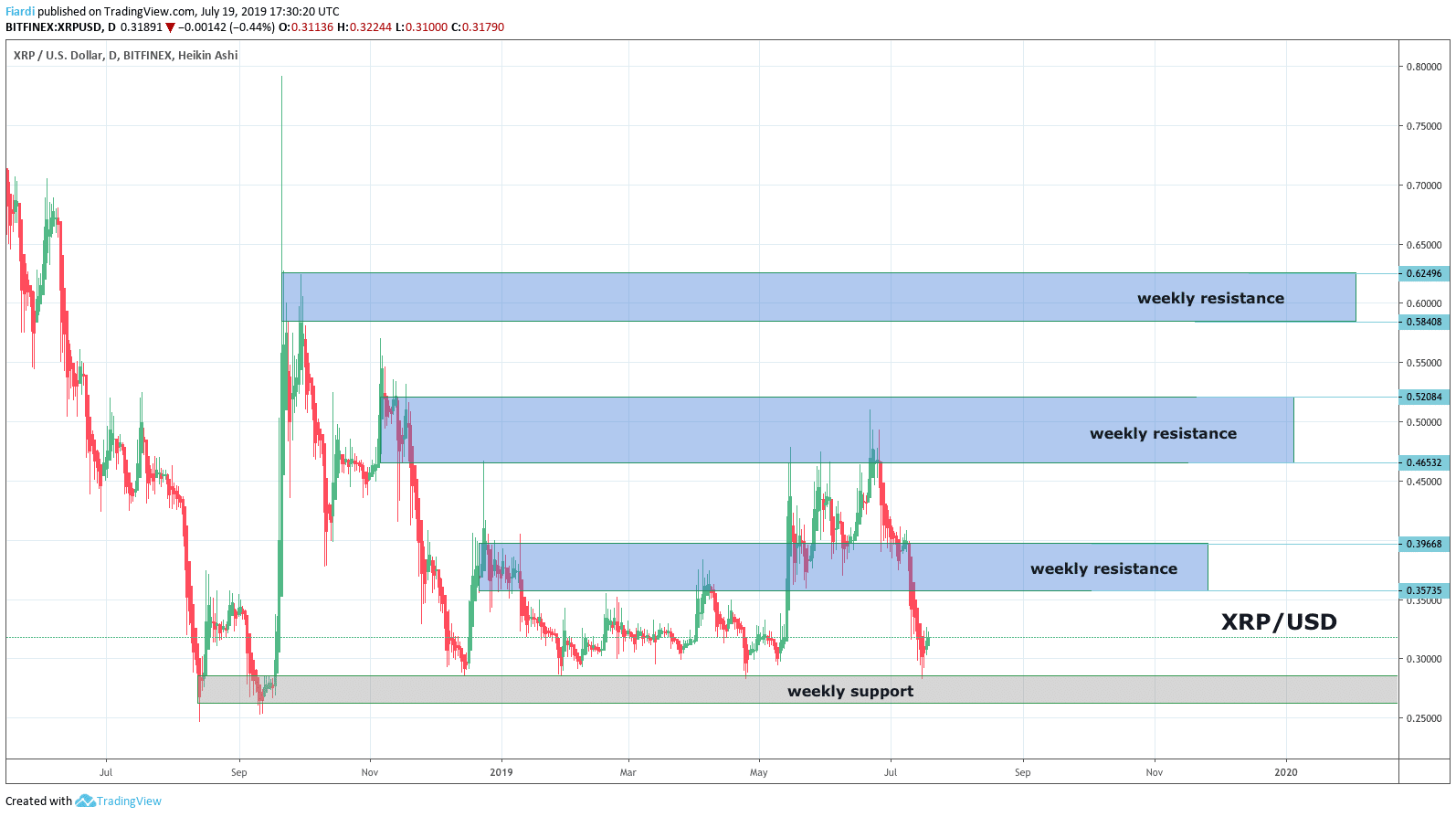 Nejbližší resistance (odpory), které bude XRP překonávat jsou na hodnotách 0,35 USD, 0,46 USD a 0,58 USD. Jedno je ale na XRP zajímavé, a to jsou obrovské zóny resistance. Na první resistanci vidíme rozptyl od 0,357 k 0,396. Tyto velké rozptyly jsou způsobeny velkým kolísáním na XRP co do budoucna může znamenat snahu bulls o manipulaci ceny a prudké navýšení hodnoty.