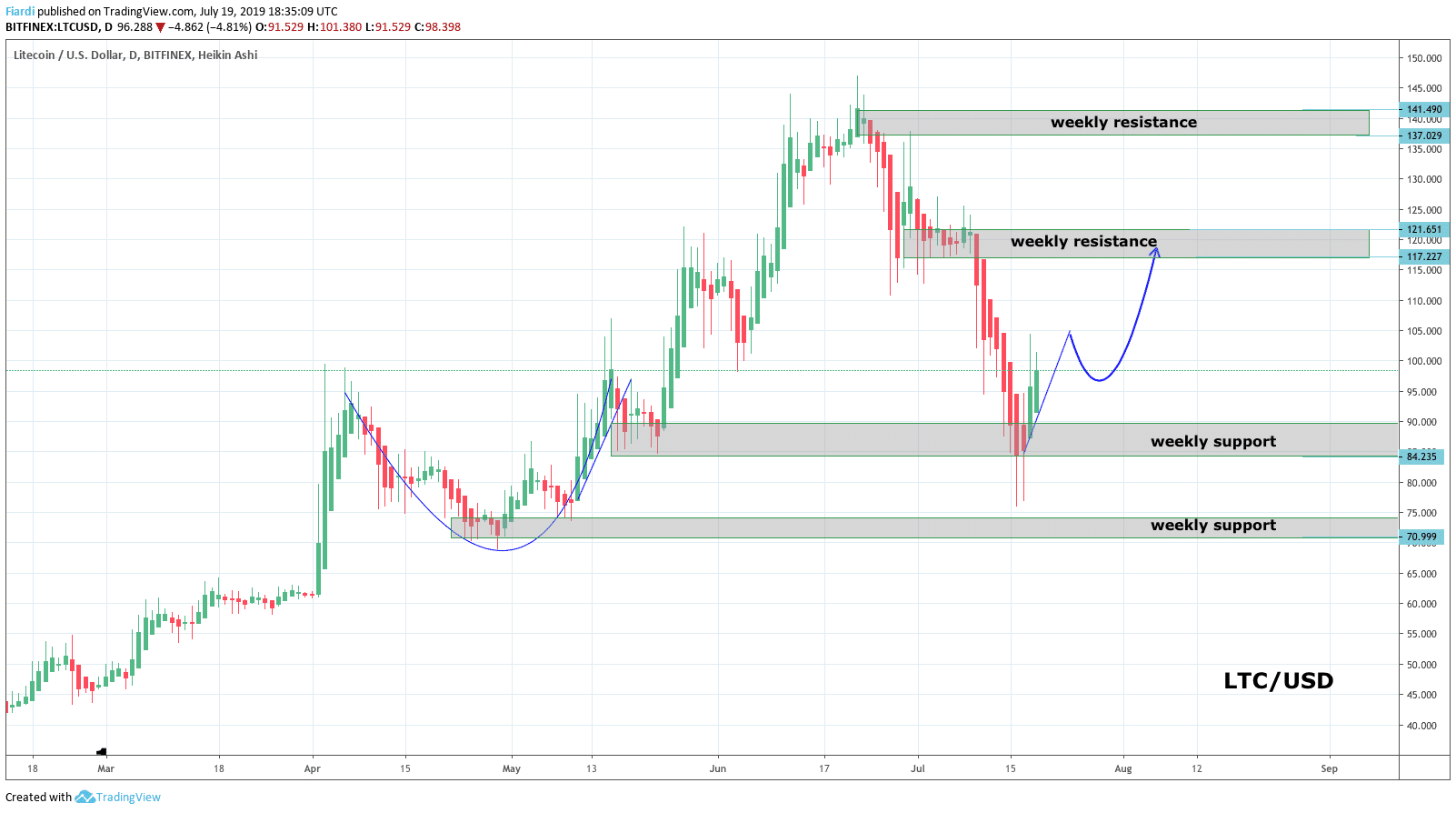 Co se týče růstu LTC tak ten bych odhadoval do halvingu na 117-120 USD, kde leží i nejbližší resistance line. Hodně bude záležet na Bitcoinu, zda udrží 10 000 USD. Predikci, kterou jsem psal na Bitcoin si umíte přečíst ZDE. Nad 120 USD se nachází následně ještě resistance na hodnotách 137-141 USD.