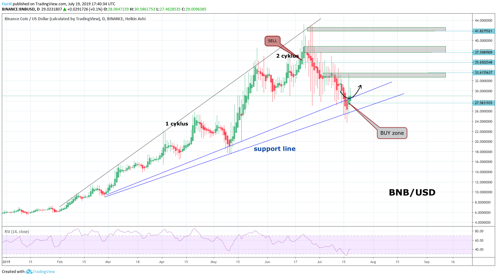 Co se týče Binance Coinu, ten poklesl z ATH na 42 USD až k 24 USD. Na BNB vidíme přesný odraz od support line směrem nahoru. Současná hodnota je těsně pod 30 USD za kus. Při pohledu na graf vidíme nejbližší resistace (odpor) na hodnotách 33,6 USD. Po překonání této resistance následuje odpor na 37,59 USD a 41,82 USD. Hodnoty nad 37,59 USD bychom mohli překonávat nejblíže zřejmě až po prázdninách, kdy se zvýší objemy na trhu.
