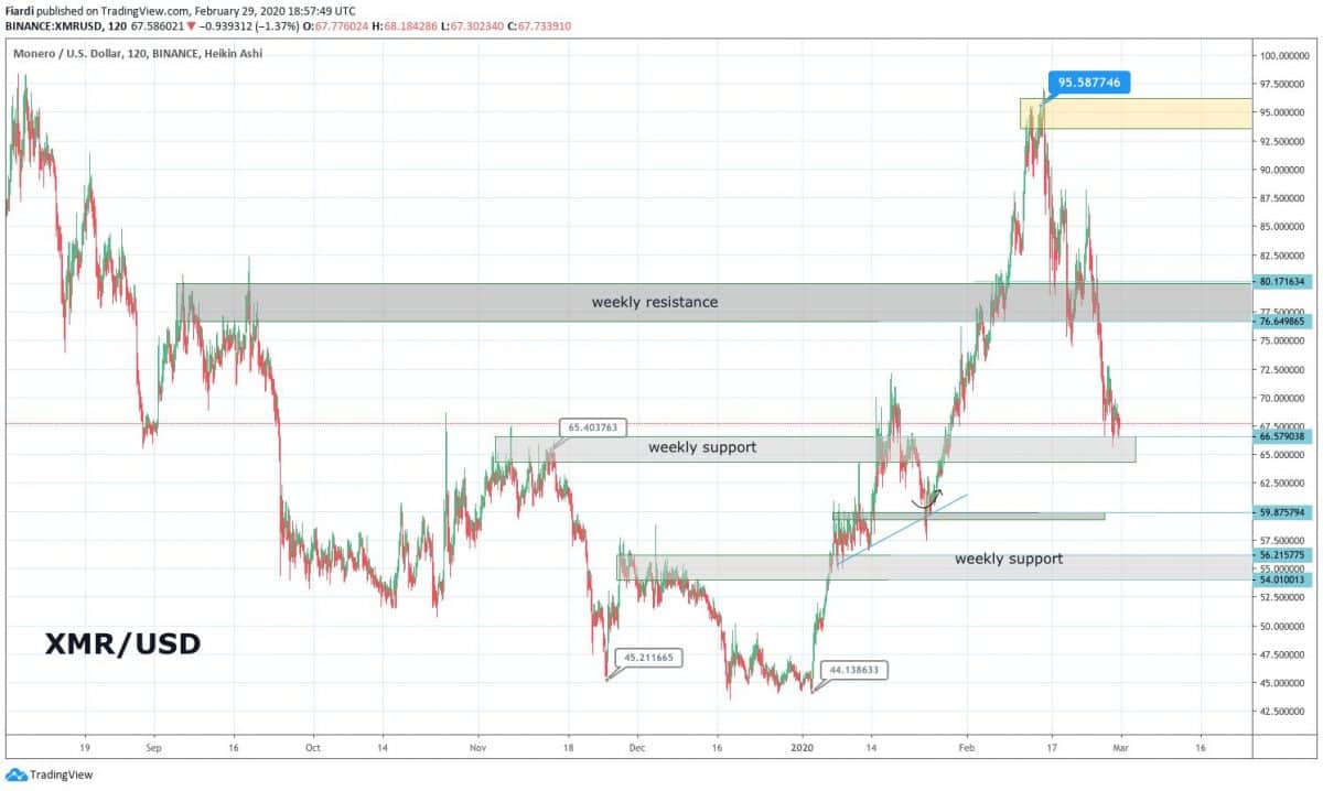Doufám ale, že budeme bránit 66,5 USD support lépe, než ten předešlý. Momentálně vidíme odpor na 80 USD, na který budou chtít bulls dosáhnout. Rok 2020 je ve znamení rychlých růstů a poklesů. Stejně tak rychle, jak jsme propadli, tak můžeme podobně rychle také růst a situace se může změnit ze dne na den. Je třeba však sledovat Bitcoin a světové indexy, jak budou reagovat na koronavirus, protože panika na světových trzích se odrazí na Bitcoinu, pak na Moneru a dalších altcoinech. Momentálně je dobré se vyhnout altcoinům s menší kapitalizací, ty budou v době propadu náchylné k větším pádům.