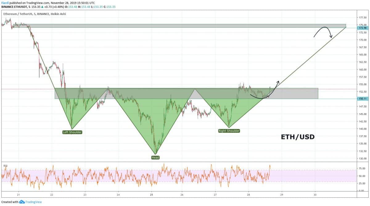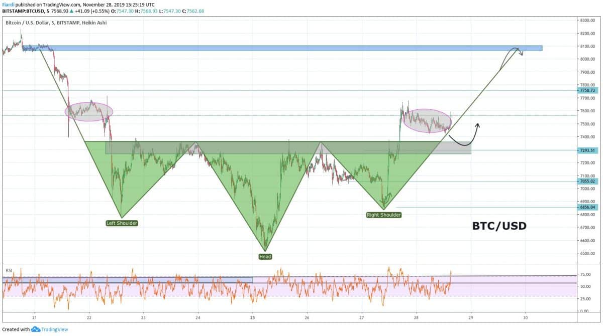 Momentální podpora začíná na 7 264 – 7 400 USD. Podle patternu by nás měla poslat pravá noha patternu prudce směrem nahoru. Pro Bitcoin je momentálně otevřená cesta k 8 100 USD. Už z předchozího cyklu je vidět, že minulému propadu nestálo nic v cestě. Stejně tomu může být i nyní při cestě k 8 100 USD.