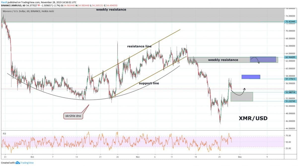 Vítám tradery a traderky u dalšího updatu na XMR/USD. Stejně jako Bitcoin i XMR ukazuje známky bullsih. Momentální hodnota je na 54 USD. Nejbližší rezistence je na hodnotě až 62,94 USD a tato hodnota by mohla být prolomena už o víkendu.