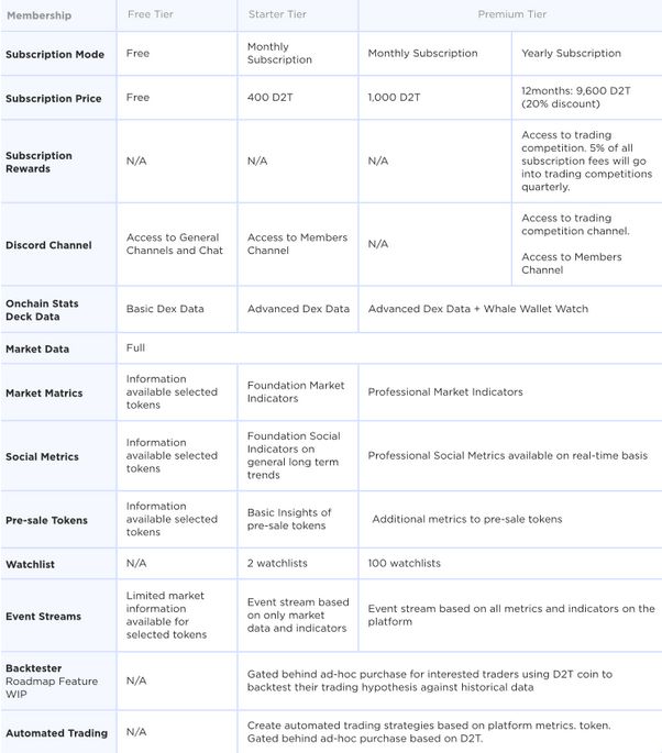 Dash 2 Trade bude fungovat na principu měsíčního předplatného, které dle zvoleného balíčku bude stát určitou částku tokenů D2T. Svou volbu můžete uskutečnit v rámci 3 balíčků předplatného – Free, Starter a Premium. Balíčky samozřejmě můžete postupem času měnit podle toho, který vám nejvíce vyhovuje.