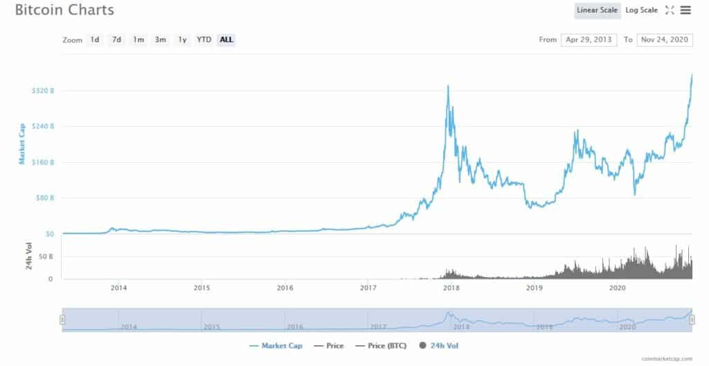 V době přípravy článku je kapitalizace BTC asi 356 miliard. To je v tuto chvíli nové ATH. Situace se však velmi rychle mění, zatímco cenou předního kryptoaktiva zmítá prudká volatilita.