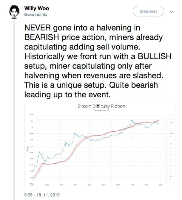 shrnul Willy Woo v pondělí na Twitteru. Woo hovořil o historických trendech v ceně BTC, kdy dva předchozí halvingy – v roce 2012 a 2016 – přišly až po několika měsících býčí cenové akce. Dříve sentiment také upřednostňoval býčí pohled na nadcházející halving v roce 2020. Tentokrát však mají medvědi kontrolu. „Tentokrát jsme šli ze 14 tisíc USD -> 7,5 tisíc USD, a to zabíjí slabé těžaře,“ vysvětlil Woo.