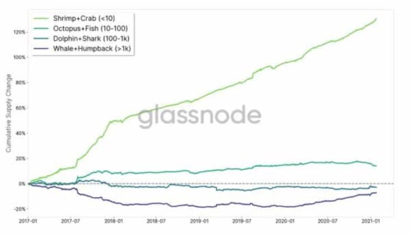 Na druhou stranu menší subjekty, které drží každý po 50 BTC (krevety, kraby a chobotnice), ovládají téměř 23 % nabídky. To ukazuje, že značné množství bitcoinů je v rukou retailových investorů.
