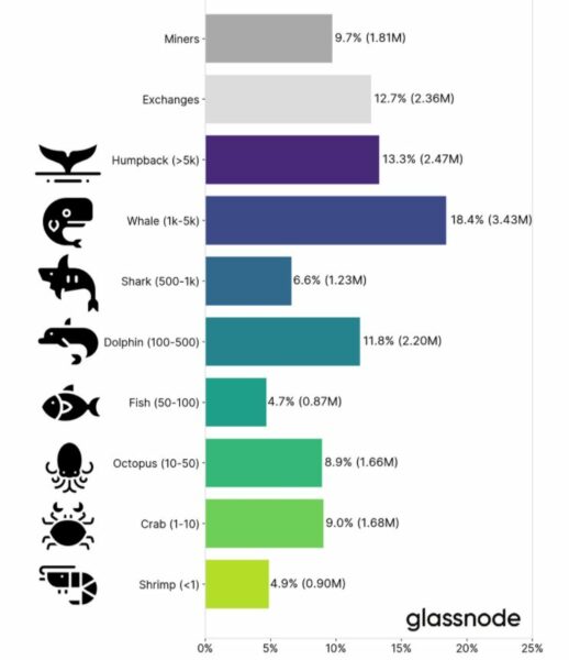 Na velkém konci spektra jsou velryby a keporkaci největšími subjekty, které společně kontrolují přibližně 31 % nabídky bitcoinů. Jedná se s největší pravděpodobností o instituce, fondy, depozitáře, OTC přepážky a další jednotlivce s vysokým čistým jměním.
