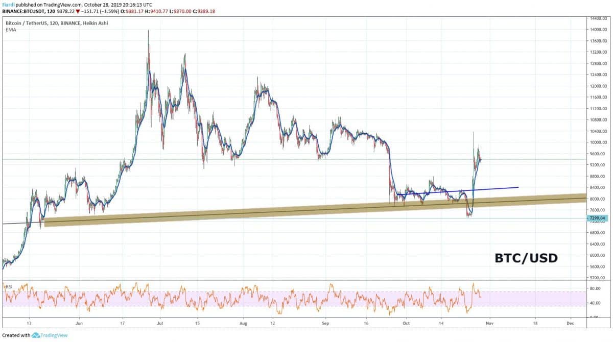 Pozitivně naladěný je i trh. Při pohledu na graf nás stále čeká silný odpor na 10 500 USD. Mnozí obchodníci zmiňují i 10 000 USD jako silný psychologický odpor, ale ten byl mnohokrát v historii snadno prolomen a tak bych to nebral až tak vážně. Momentální podpora je na 9 300 USD.