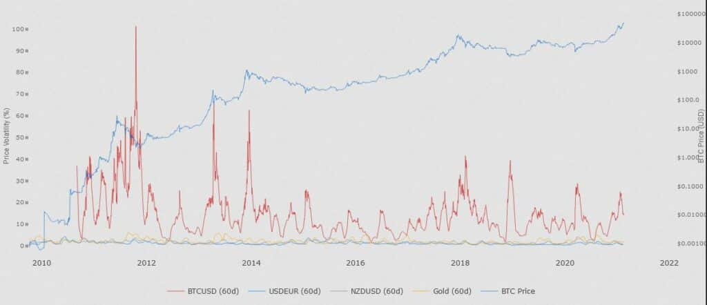 Cenové výkyvy Bitcoinu jsou však stále řádově vyšší než u zlata, se kterým je někdy porovnáván (viz termín „digitální zlato“). Data od Skew uvádějí současnou tříměsíční realizovanou volatilitu Bitcoinu na 90 %., což je více než pětinásobek cenových výkyvů u zlata.